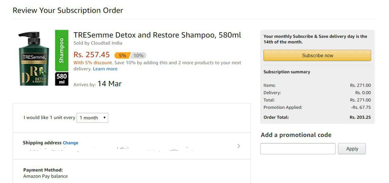 TRESemme Detox and Restore Shampoo, 580ml @ 203 Apply 20% Now click subscribe & save 5% Extra off click subscribe now Final amount 203 Link : https://amzn.to/2SFX374 TRESemme Nourish and Replenish Shampoo, 580ml @ 233 susbscribe & save 5% Link: https://amzn.to/2C1tRBT *You can cancel the subscription later.
